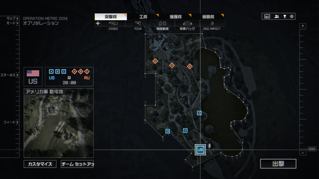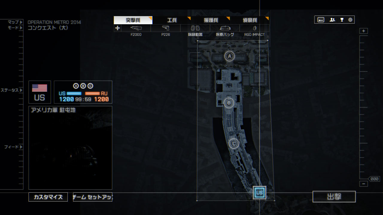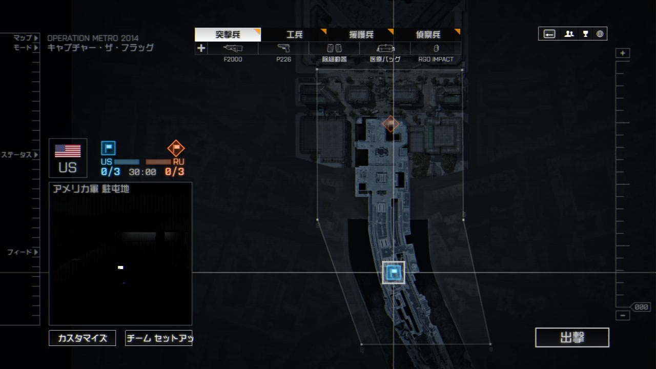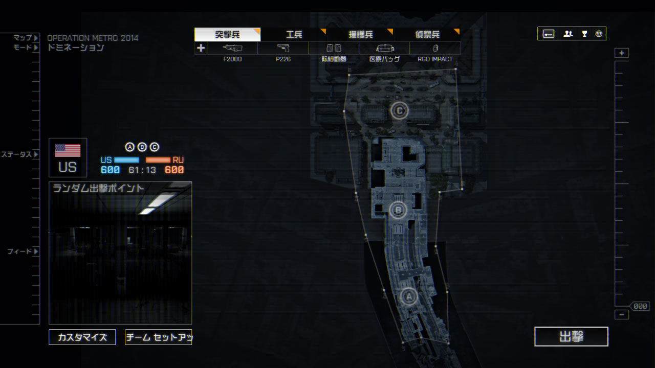 RU側は拠点Aから見て改札まで高低差はなく一直線でいけるが見通しがいいので拠点Bを制圧されると攻めづらくなる。また拠点Aも建物が複雑なので侵入した敵にやられやすい。