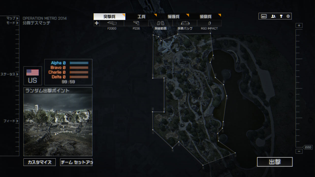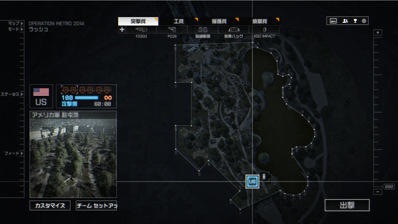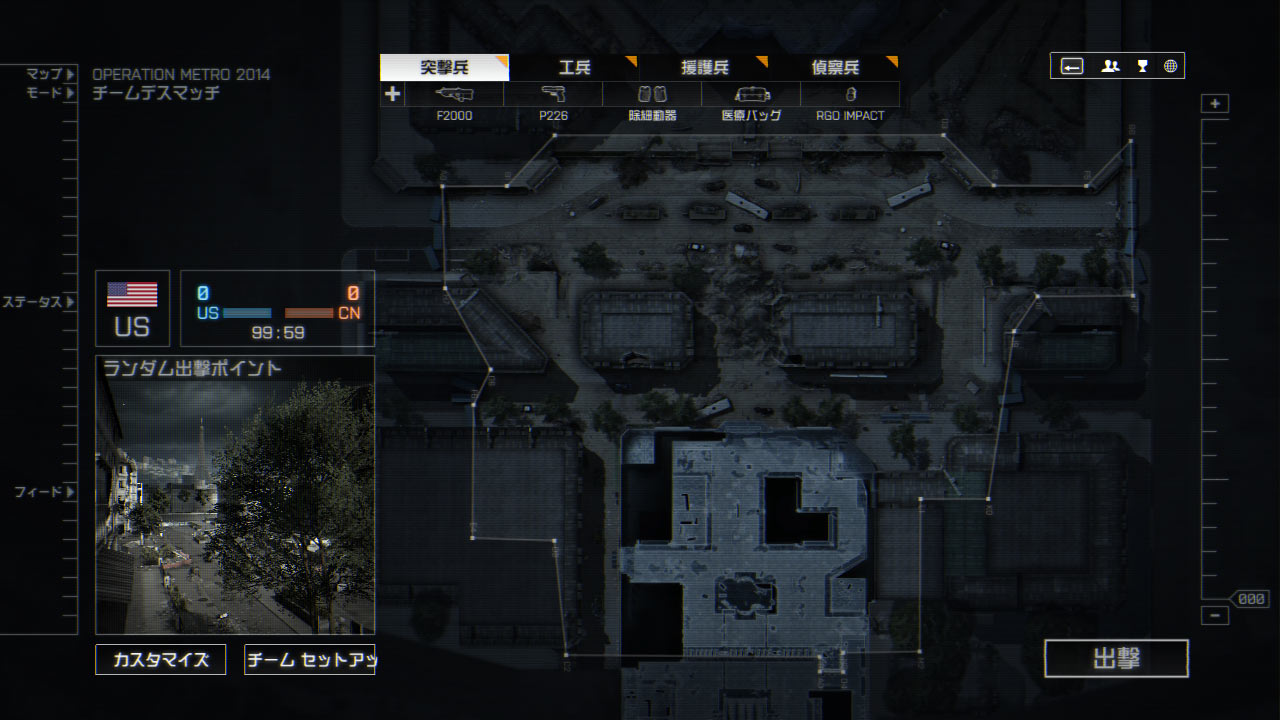 地下鉄内から始まるUS側は拠点Bを制圧された場合、銃砲弾の雨の中階段(エスカレーター)を駆け上がる事になるので開幕後、素早く抑えておきたい。グレネードの種類や最大所持数など前作より増加しているのでより突破が困難になるだろう。今作はエレベータと新しい通路が使えるので上手く利用しよう。ただし、新しい通路は崩壊していて使えないことがある。