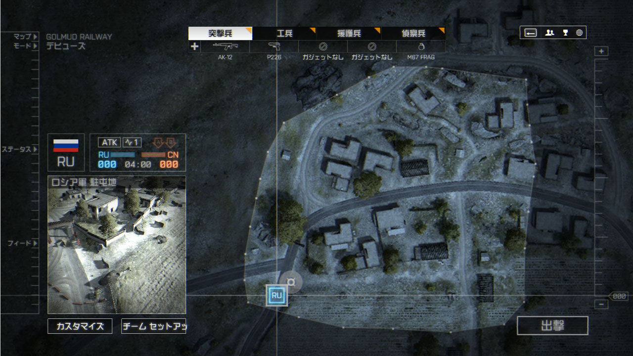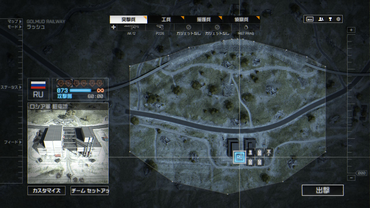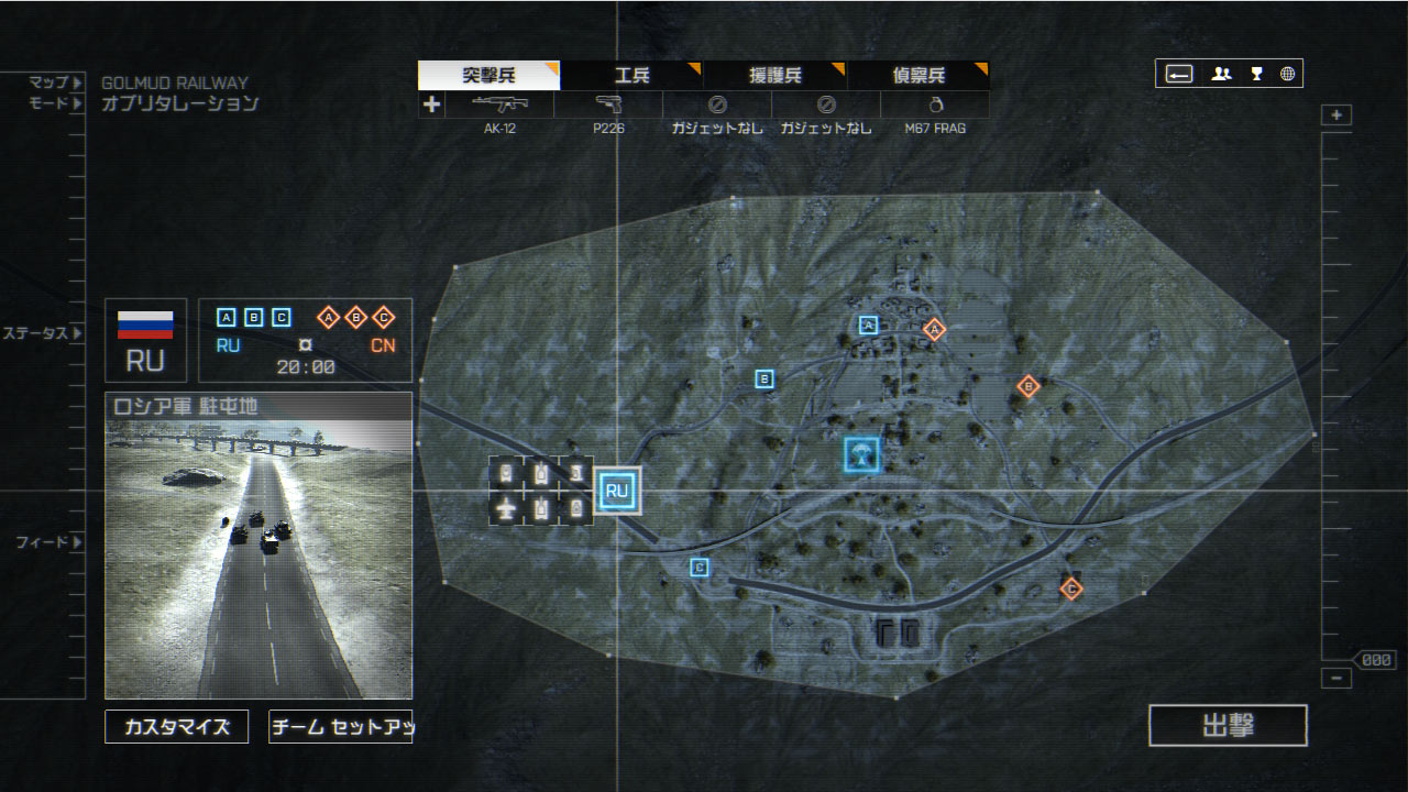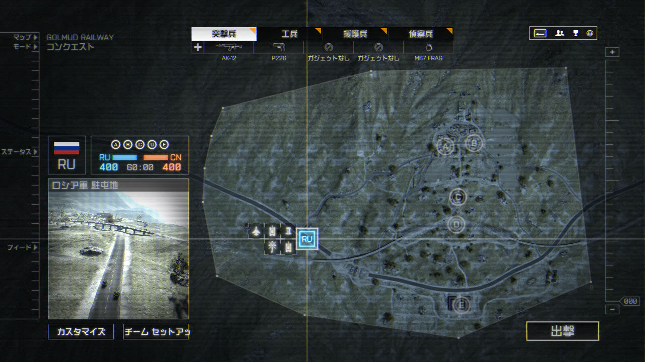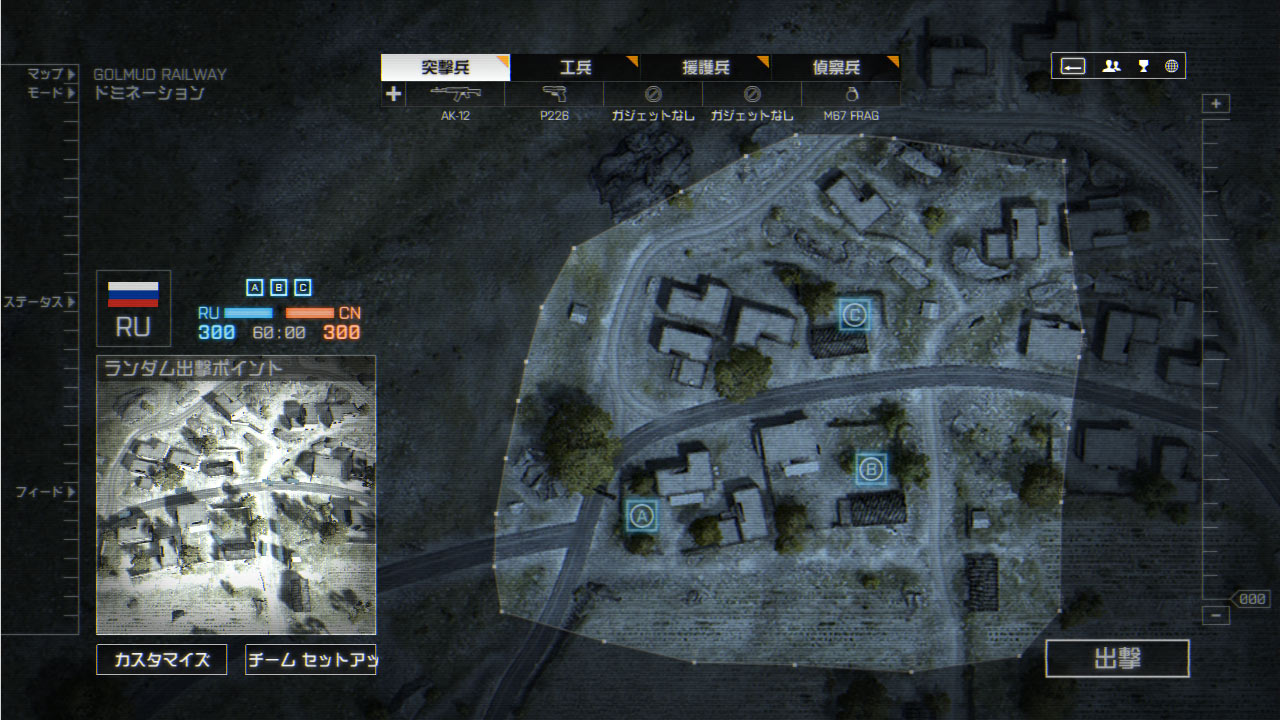 RU側はA・C拠点に対して比較的拓けた地形配置の都合上拠点に近づきながら拠点や拠点を防衛している敵チームに対して攻撃ができるが、CN側は稜線や山脈により安全に身を隠せる地形配置ながら、一定距離まで近づかないと拠点に対して攻撃できない。