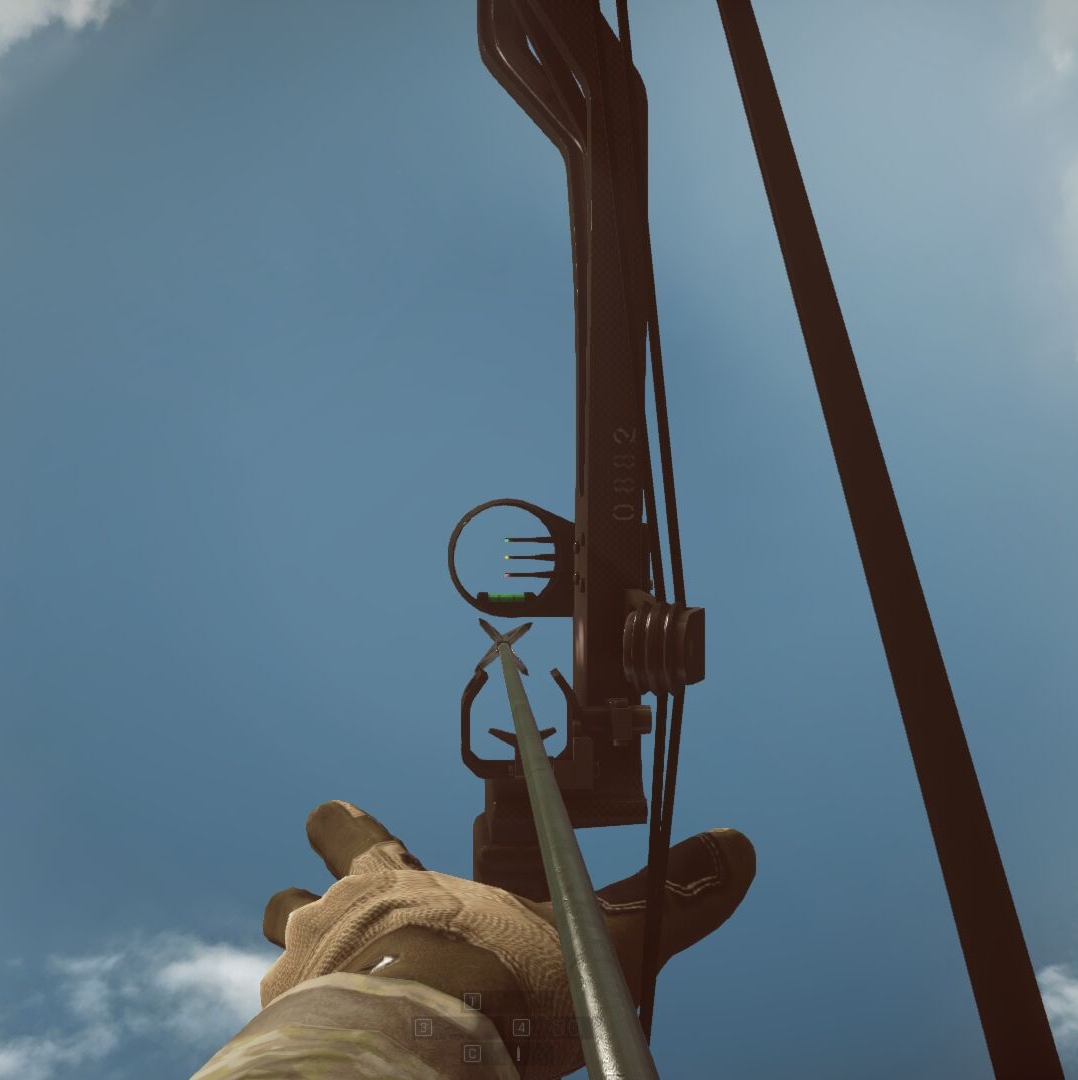 所謂コンパウンドボウ(Compound bow)と言われる市販もされている狩猟用の弓。鹿や熊などいった大型の獣を狩るのに使う。